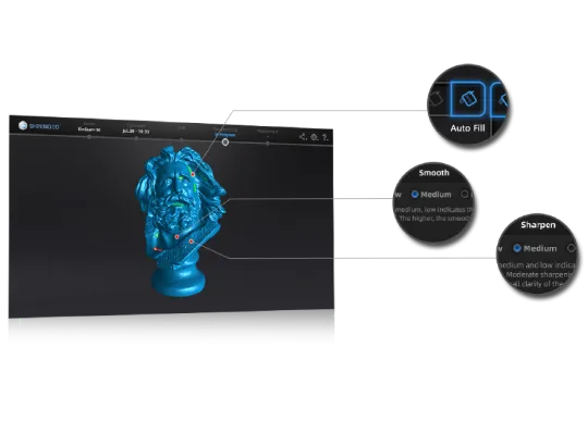 Сетка автоматически обрабатывается после сканирования, и данные можно улучшить с помощью набора расширенных инструментов редактирования, таких как очистка, заполнение отверстий, упрощение данных, сглаживание, повышение резкости и т. д.