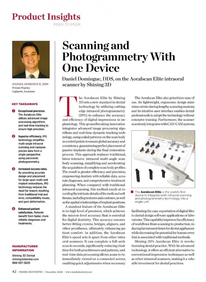 Aoralscan Elite — первое в мире устройство, объединяющее в себе функции интраорального сканирования и фотограмметрии. Устройство функционирует как стандартный интраоральный сканер (IOS) для получения изображений при полном отсутствии зубов, позволяя проводить детальное сканирование зубов и структур полости рта. Кроме того, оно служит фотограмметрии, которая используется для точной регистрации положения дентальных имплантатов при полной адентии. Эта двойная функциональность делает его универсальным как для традиционных стоматологических процедур, так и для сложных имплантационных процедур. Это новаторское нововведение обеспечивает комплексную дентальную визуализацию и точное позиционирование имплантатов, устанавливая новый стандарт в стоматологических технологиях.
